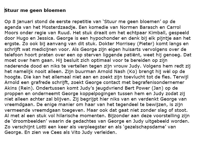 Stuur me geen bloemen - Verslag